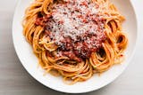 A heaping serving of spaghetti noodles served with your choice of meatballs or sausage, topped with Vella’s marinara sauce.